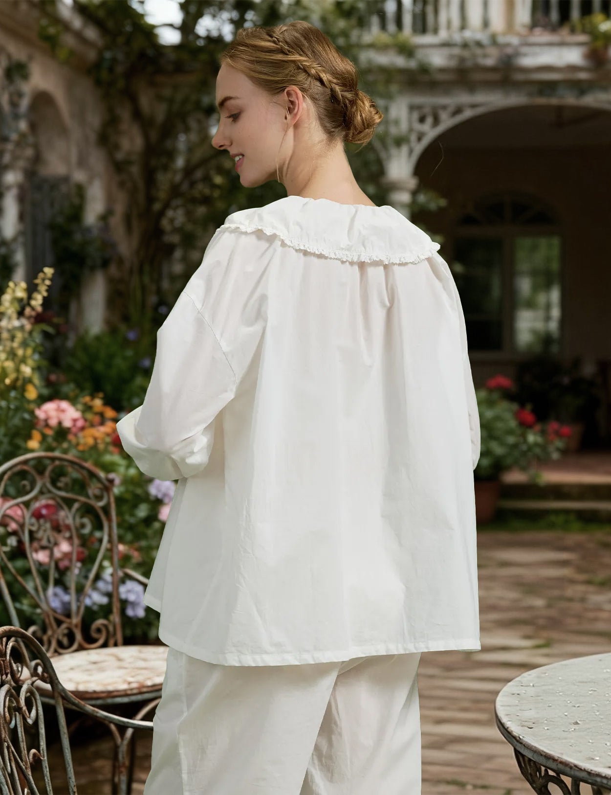 Embroidery Floral Cotton Top with Ruffle Collar & Flounced Hem