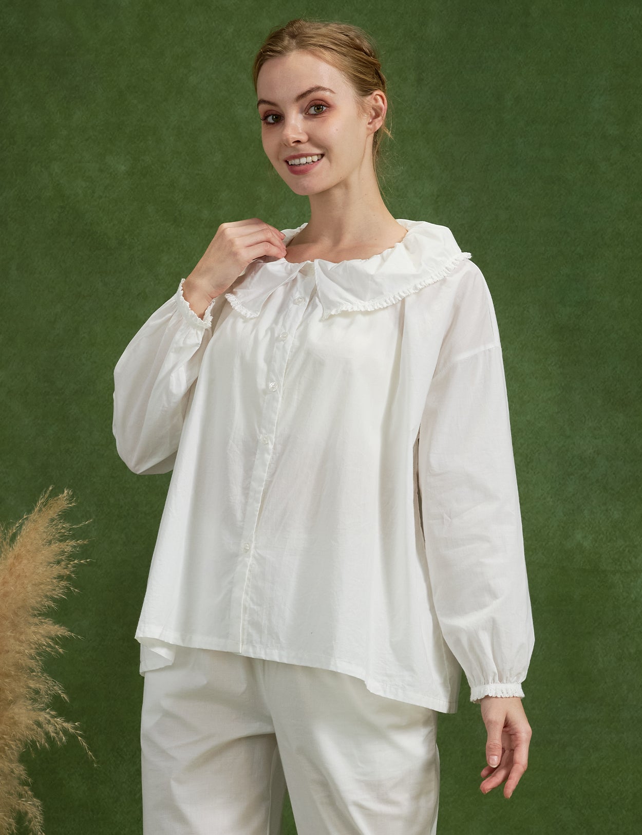 Embroidery Floral Cotton Top with Ruffle Collar & Flounced Hem