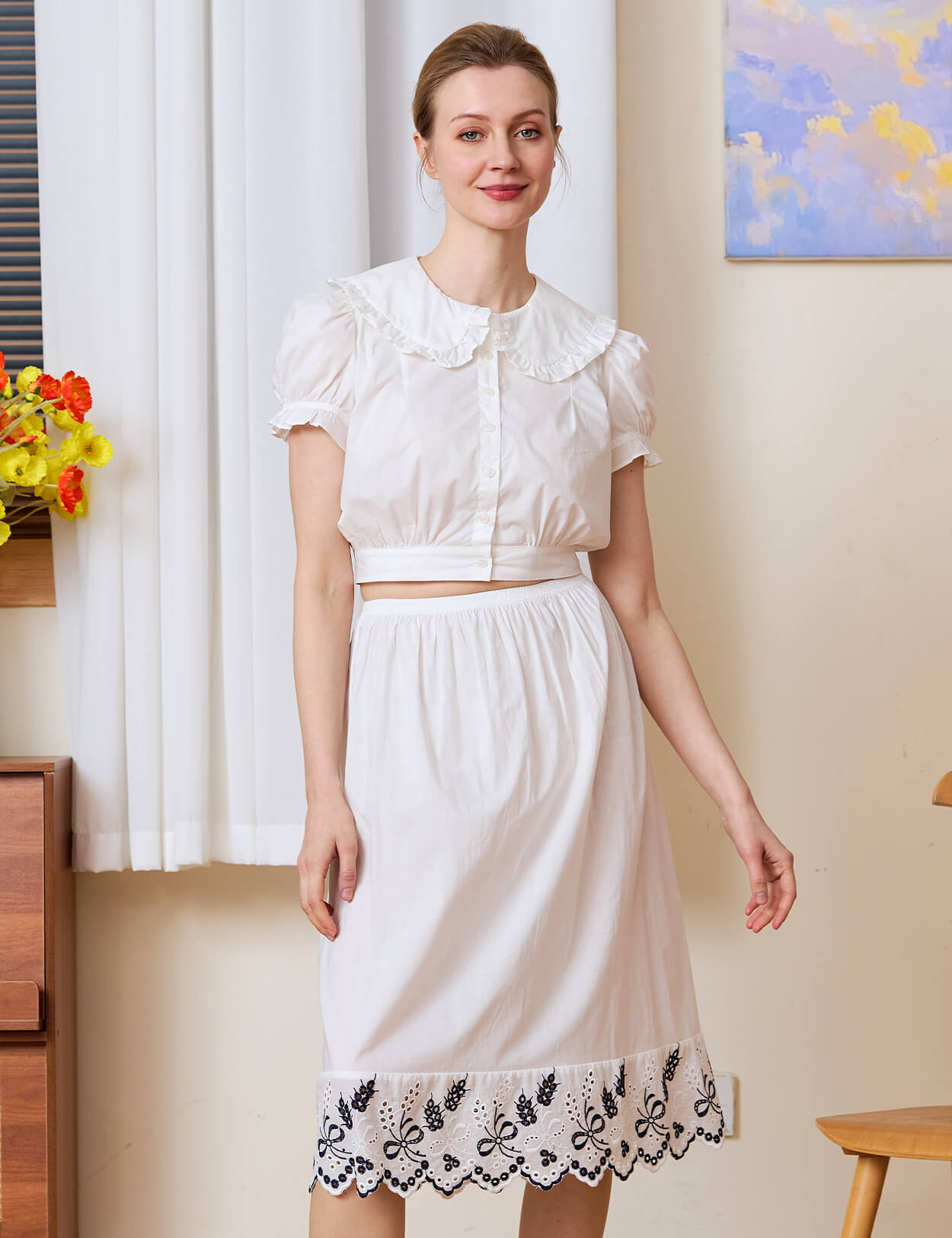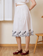 Crafted from a soft, lightweight, and breathable cotton fabric, The Catherine is available in two lengths. We highly recommend layering it under solid black skirts or dresses, allowing the beautifully contrasting embroidered hem to peek out for a striking and cohesive vintage look.