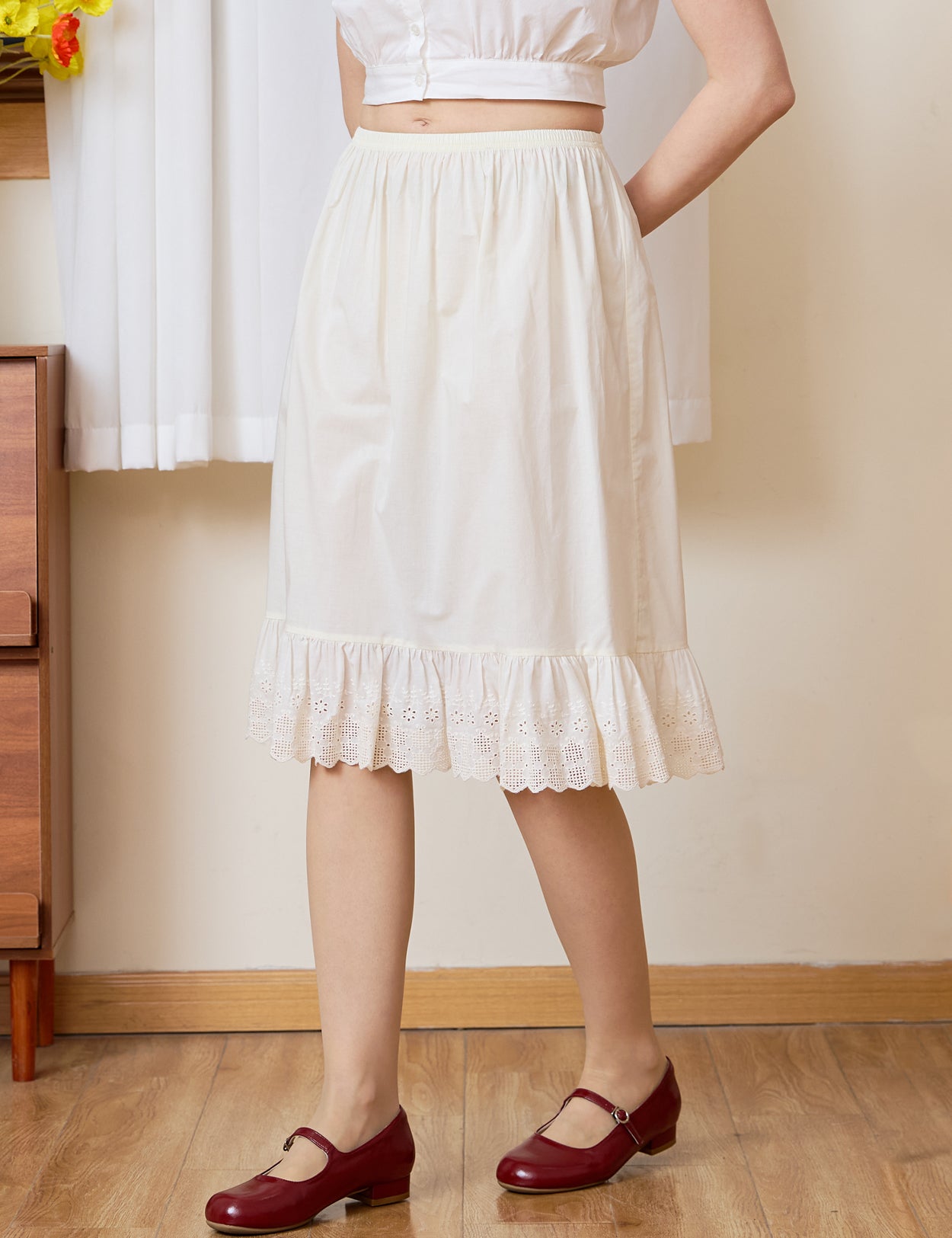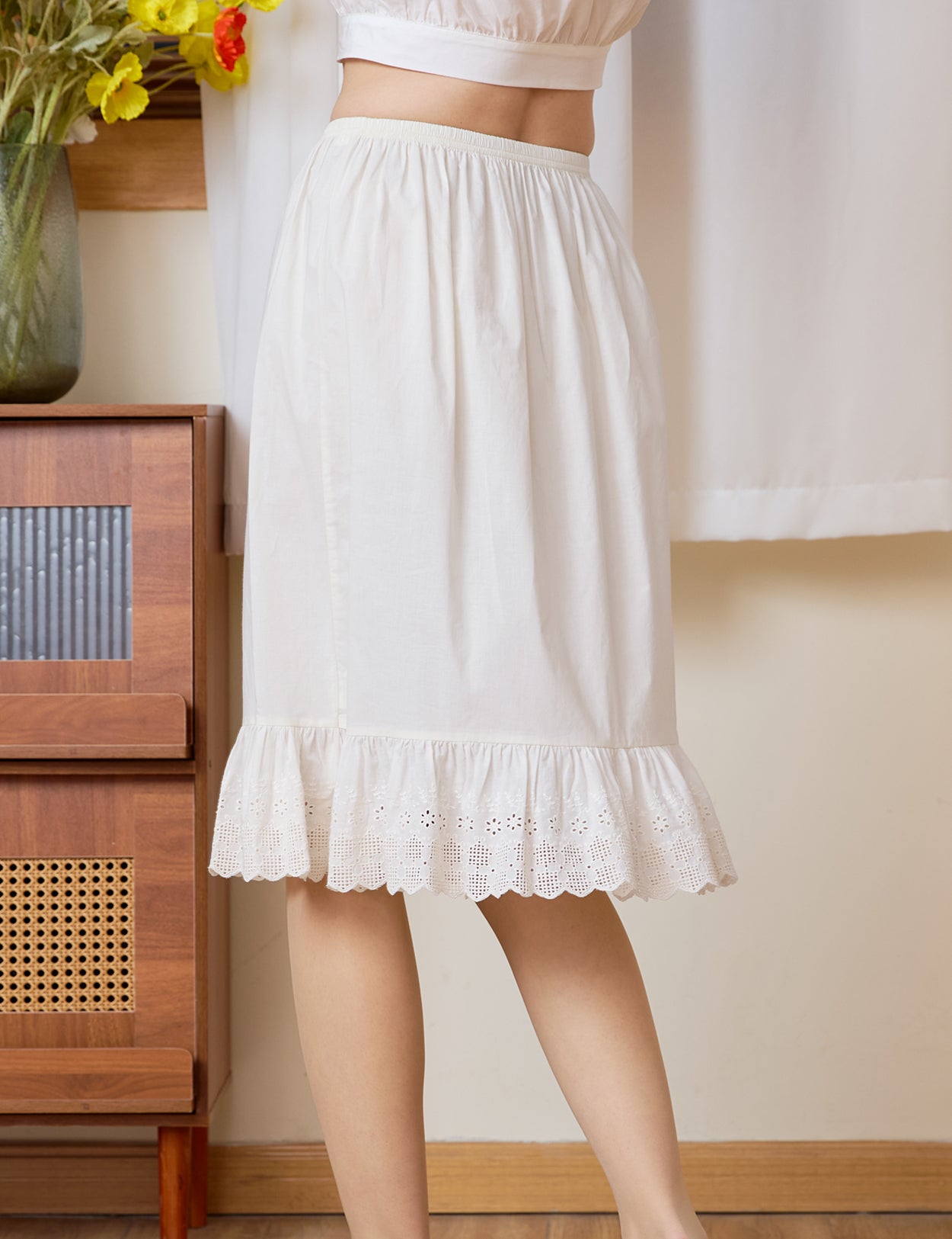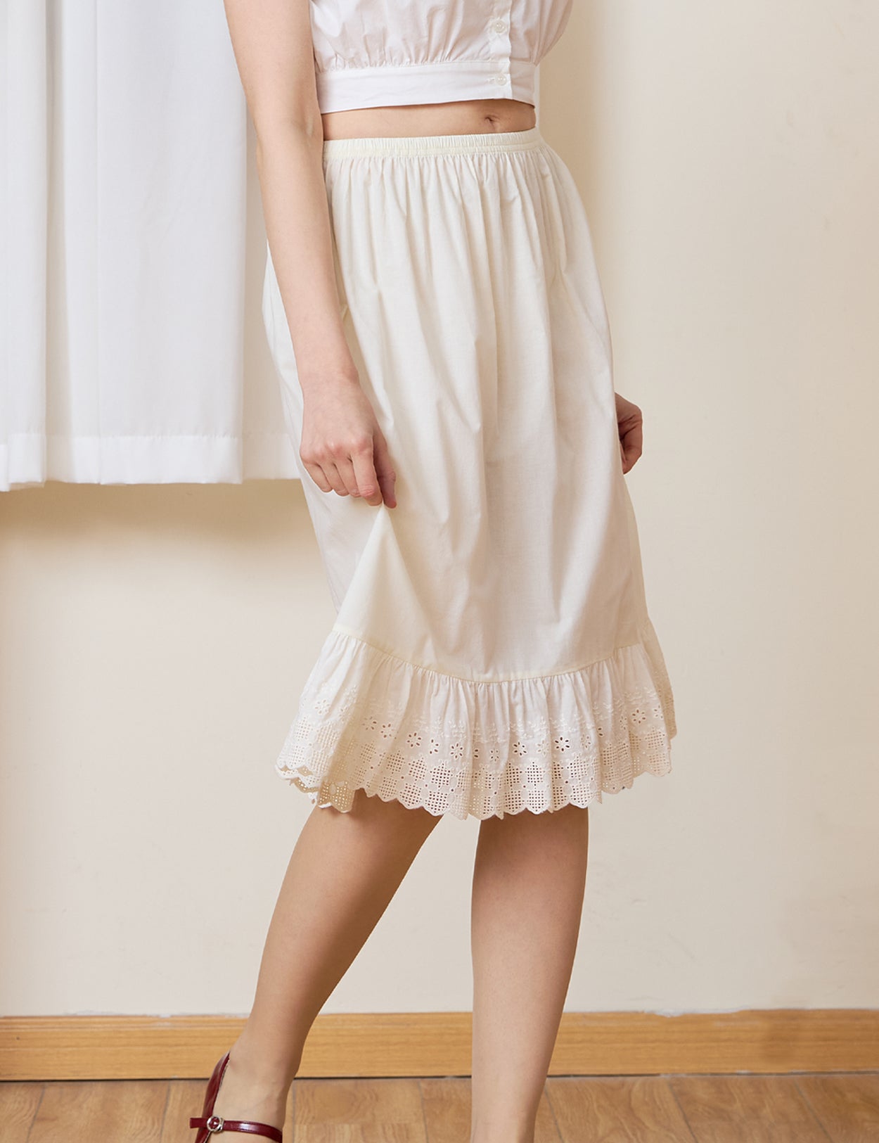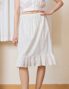 Falling just below the knee, this adaptable petticoat features a flexible elastic waist for ultimate ease. Let the intricate lace playfully peek out from under a midi skirt, wear it as a reliable opaque foundation, or enjoy it as a breezy standalone skirt. Available in natural Ivory and Cream.
