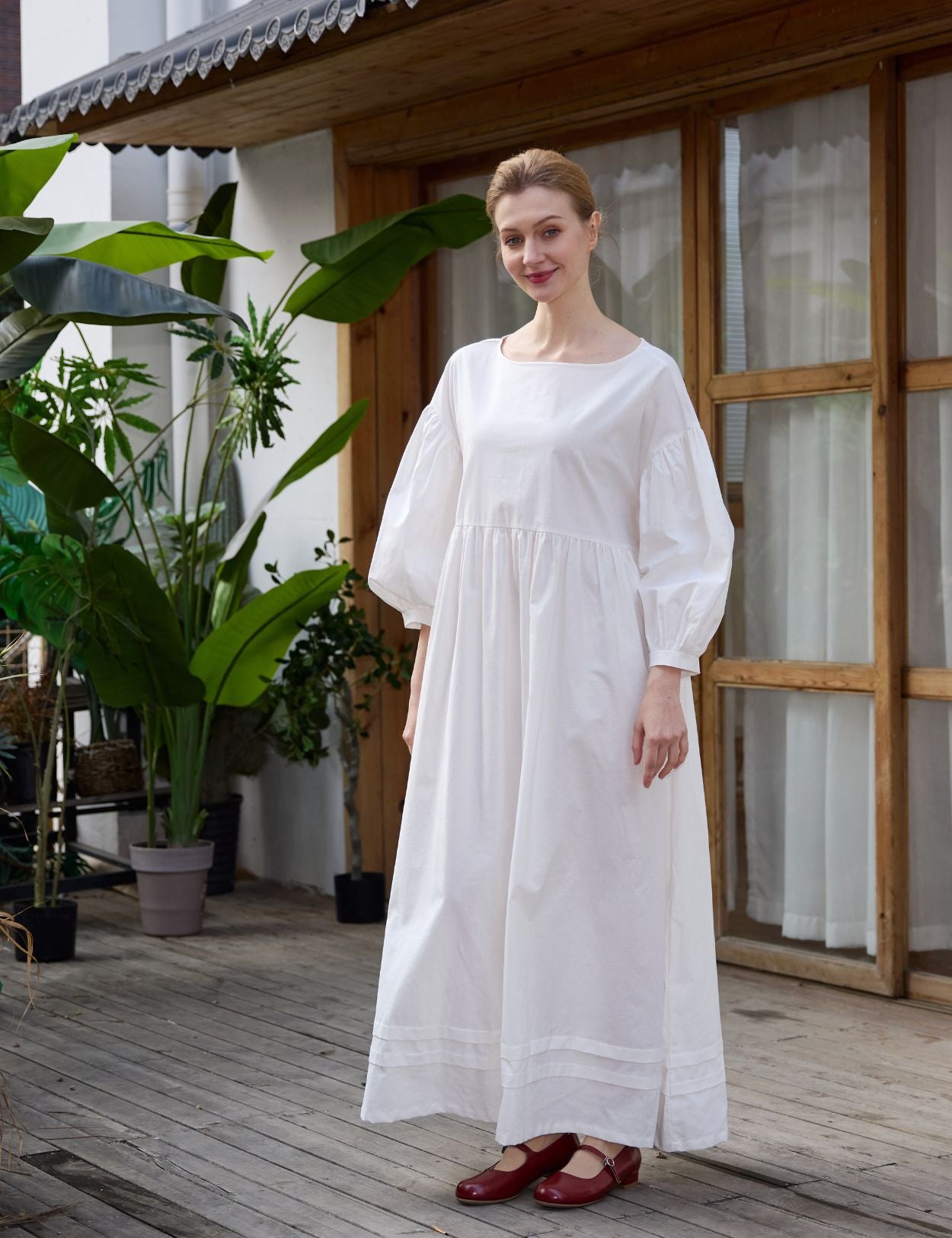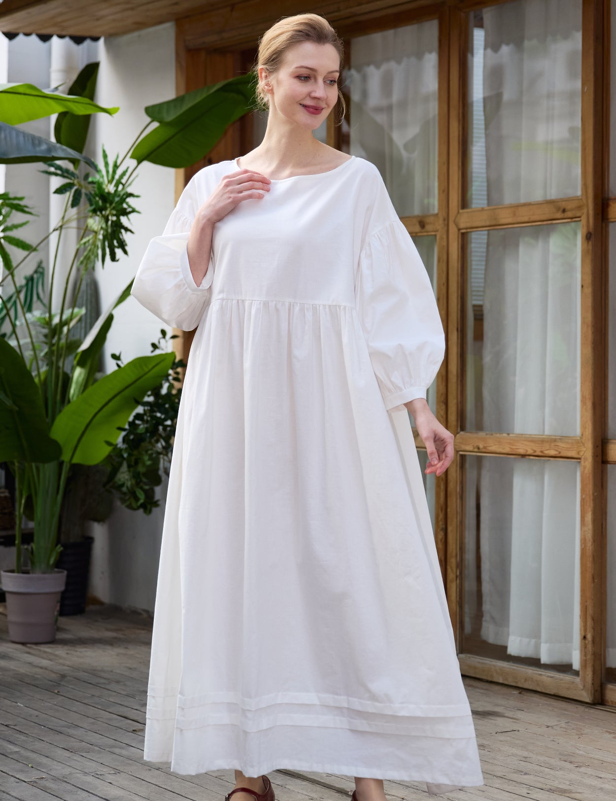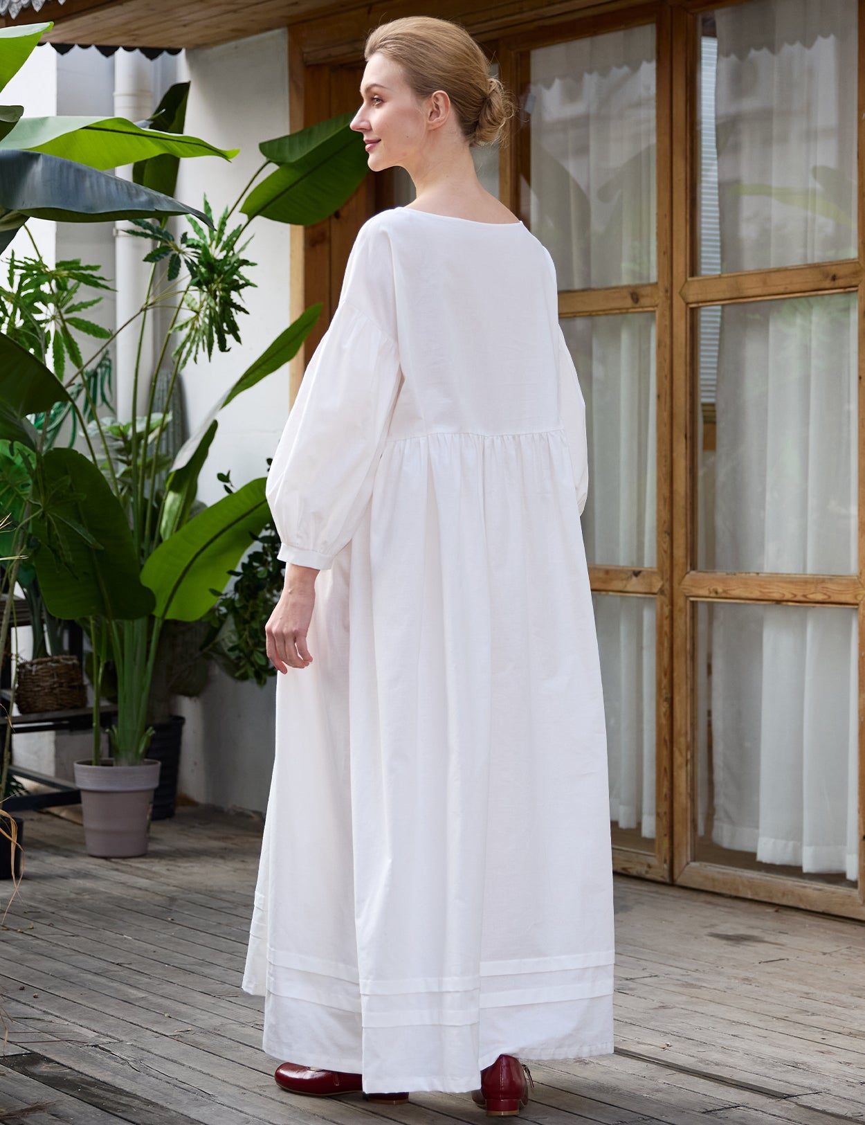 Crafted from breathable 100% pure cotton, this piece features a classic boat neckline and relaxed drop shoulders. The voluminous long sleeves and softly gathered high waist flow naturally into a sweeping skirt, beautifully finished with historical pintuck detailing at the hem.