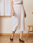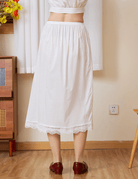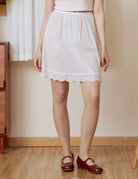 Cut from breathable 100% cotton, it features a forgiving elastic waistband and a neat A-line shape that layers easily without feeling bulky. The hem is finished with a simple scalloped lace trim, adding a soft, nostalgic touch to a practical basic.