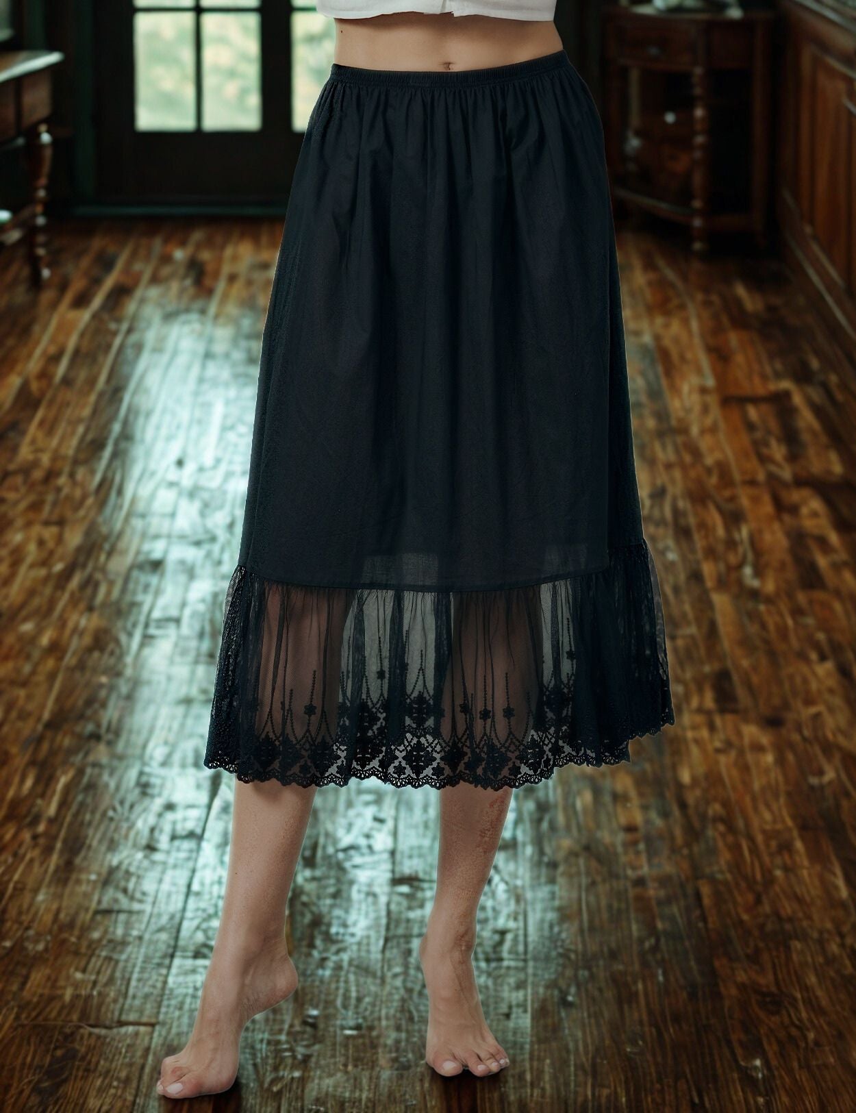 Indulge in the feel of cotton with our crafted half slip. It boasts a soft, anti-static, and breathable fabric that provides a cool sensation against your skin. Revel in a perfect fit with our comfortable elastic waistband, available in five sizes to ensure it never tightens around your waist. Effortlessly elevate your skirt or dress with our skirt extender, embellished with flower lace for an elegant touch. Additionally, it can be worn as a petticoat, seamlessly complementing vintage 1850s pioneer dresses or lengthening Edwardian lawn dresses for an added touch of fullness. Ideal for enhancing the charm of see-through and unlined dresses.