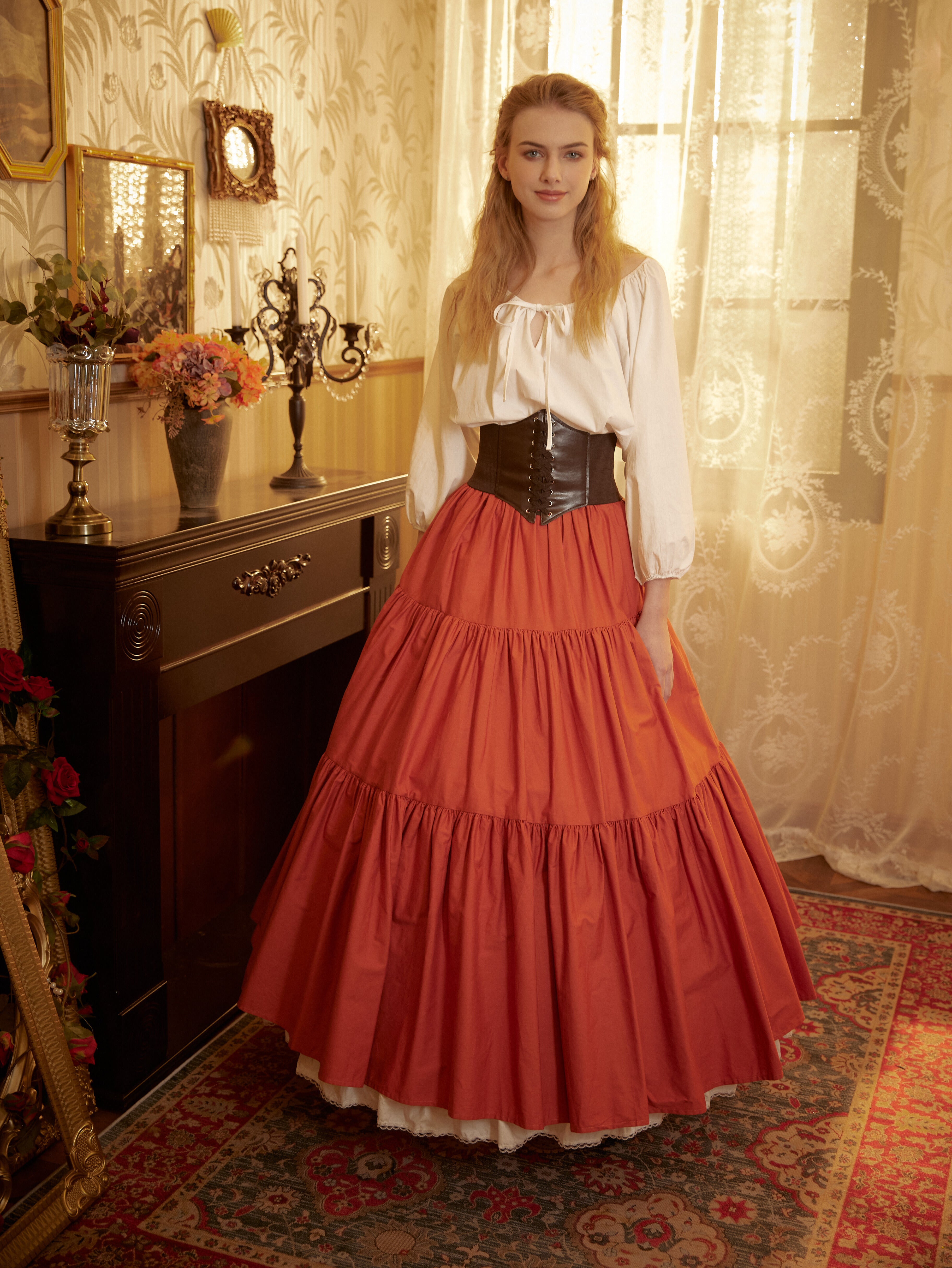 Versatile Heritage: With a generous 41-inch (105cm) wide hem, it can be styled as a standalone statement piece or layered over an A-line hoop skirt for a grand historical silhouette.