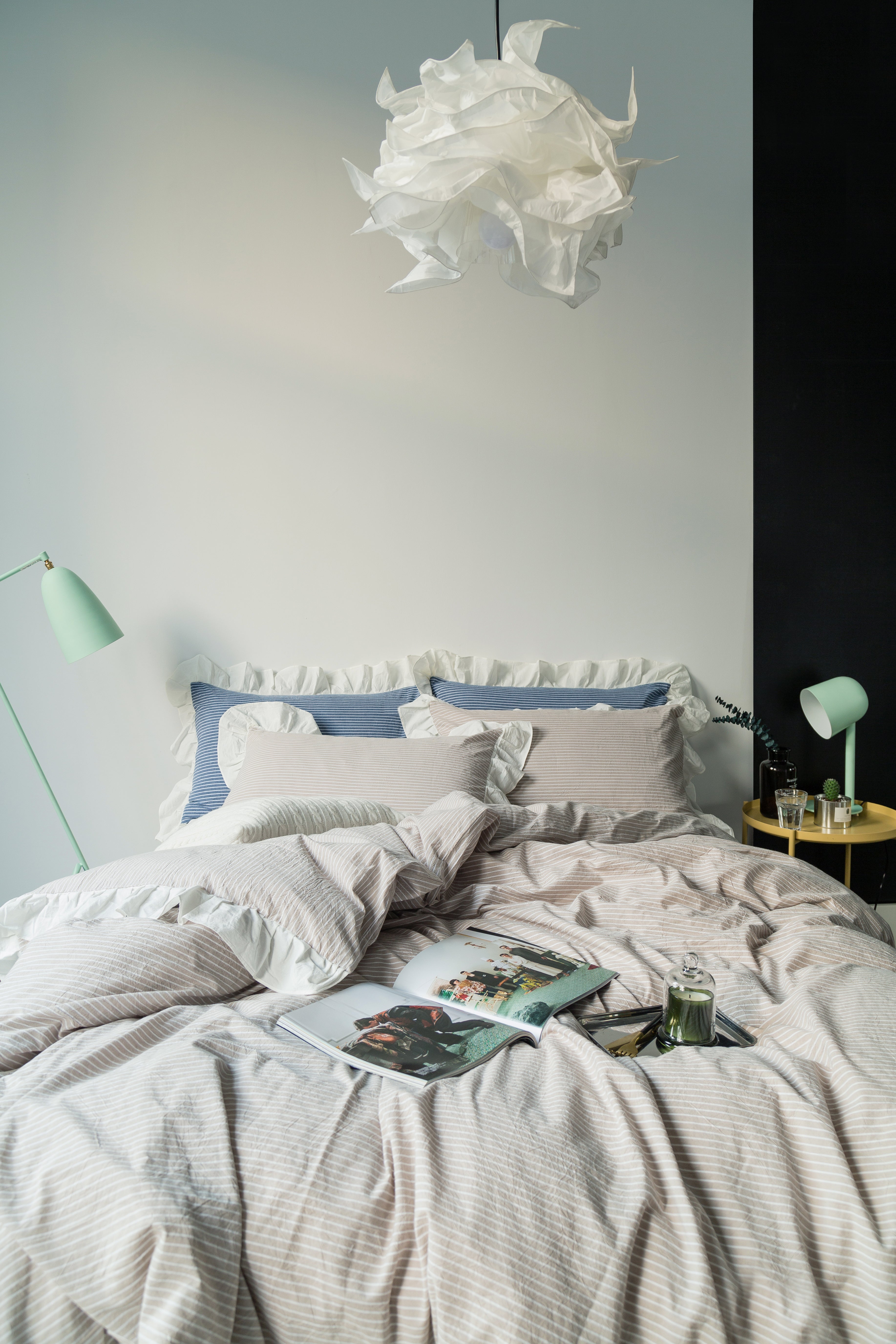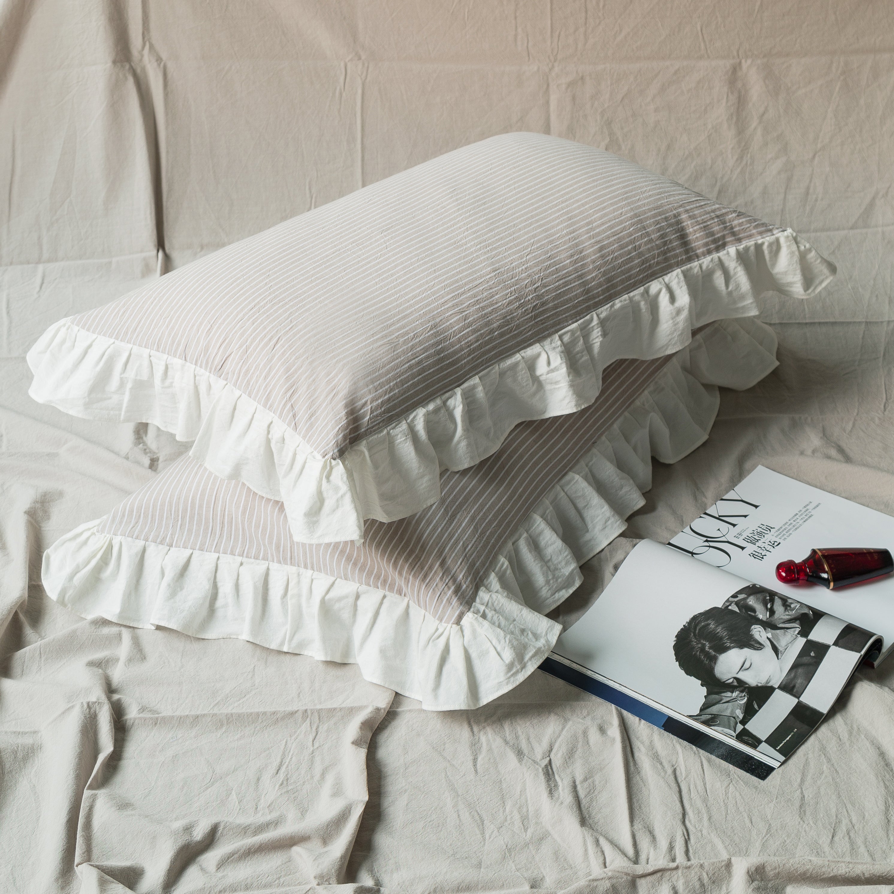 Designed with delicate beige stripes and elegant white lace-tassel ruffles. The intentionally relaxed, slightly wrinkled texture enhances its charming vintage farmhouse aesthetic, adding a touch of sweet, romantic princess-inspired elegance to your bedroom.