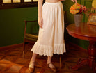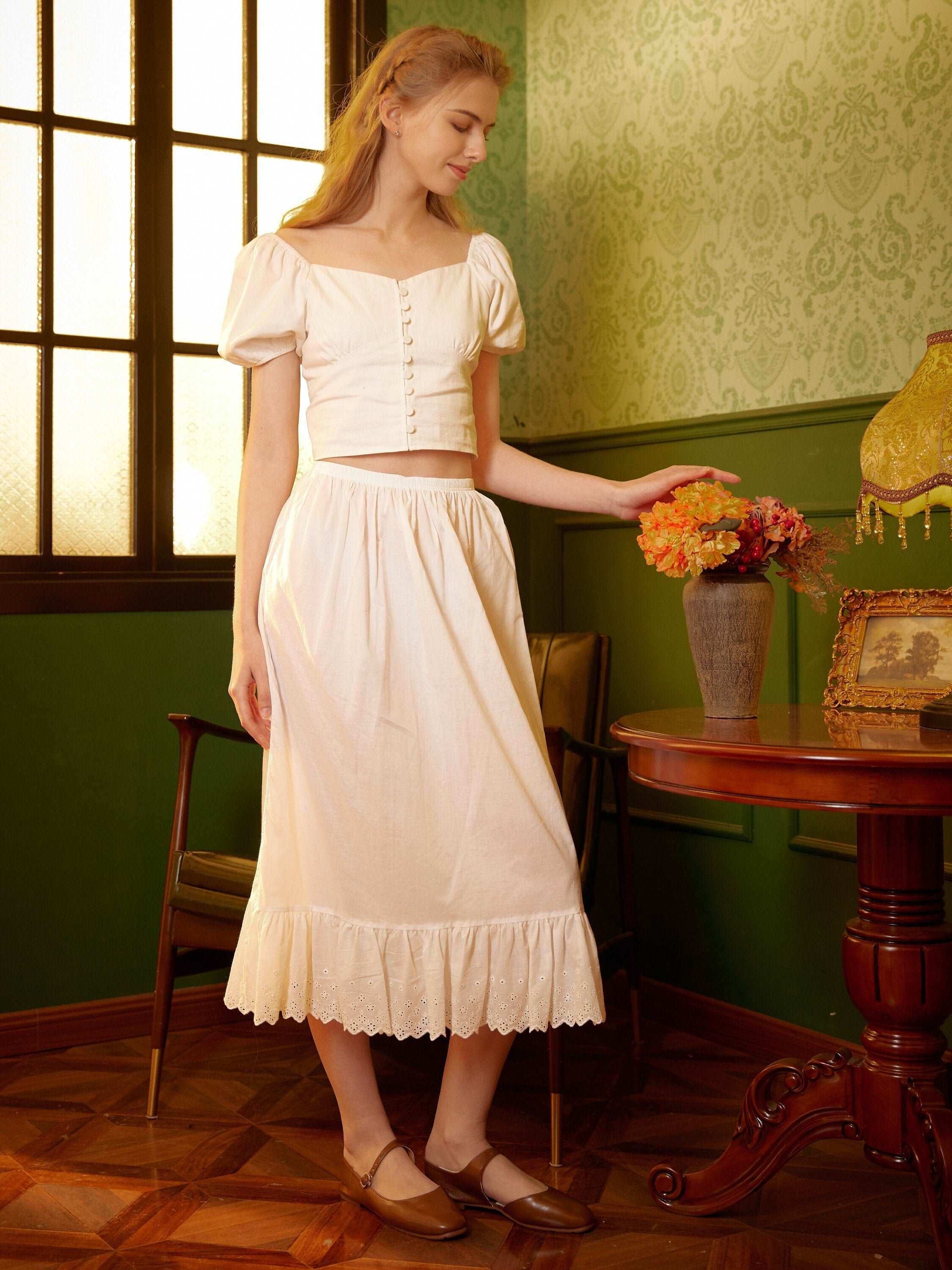 Genießen Sie das Gefühl von 100 % Baumwolle mit unserem handgefertigten Unterkleid. Es besticht durch sein weiches, antistatisches und atmungsaktives Material, das ein kühles Gefühl auf der Haut vermittelt. Genießen Sie die perfekte Passform mit unserem bequemen, elastischen Bund, der in fünf Größen erhältlich ist und dafür sorgt, dass er Ihre Taille nicht einschnürt. Verschönern Sie Ihren Rock oder Ihr Kleid mühelos mit unserem Rockverlängerer, der mit zarter Lochspitze verziert ist und für einen eleganten Touch sorgt. Er kann auch als Unterrock getragen werden und ergänzt perfekt Vintage-Pionierkleider aus den 1850er-Jahren oder verlängert edwardianische Batistkleider für mehr Fülle. Ideal, um den Charme von durchsichtigen und ungefütterten Kleidern zu unterstreichen.