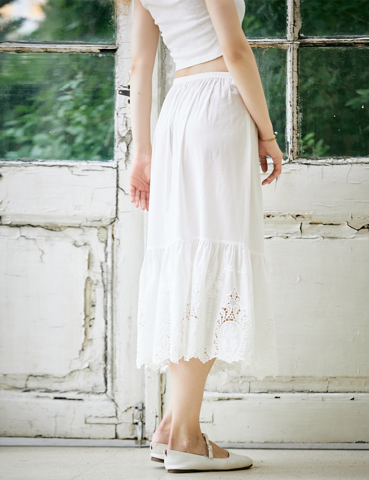 Das „Spiegel“-Motiv: Für dieses Stück haben wir die authentische Kunst der Broderie Anglaise wiederbelebt. Der Saum ziert unser charakteristisches ovales Medaillon – eine filigrane Lochstickerei, die an die antiken Handspiegel eines Schminktisches aus dem 19. Jahrhundert erinnert.