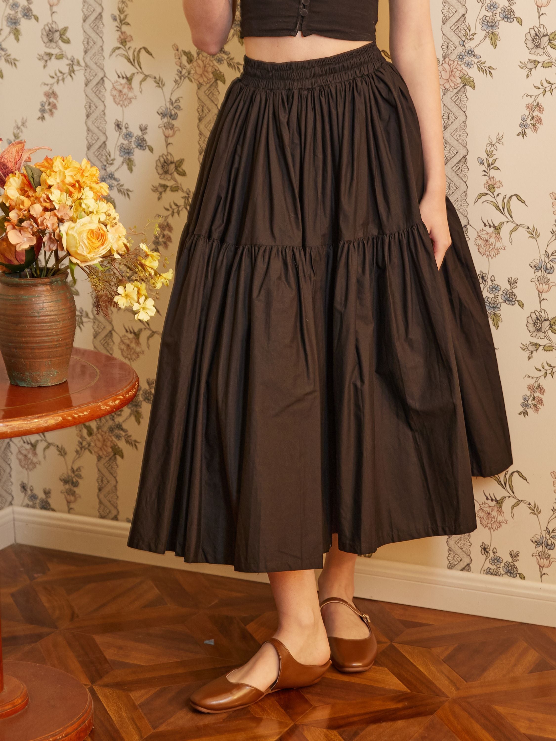 Brauner Rock, gestufter Maxirock mit Tasche, langer Baumwollrock, Boho-Plisseerock, flexibler Bund, perfekt für alle Jahreszeiten