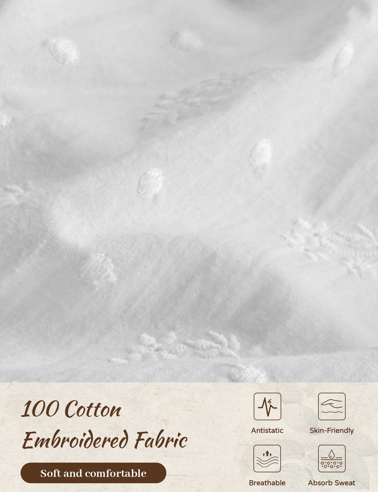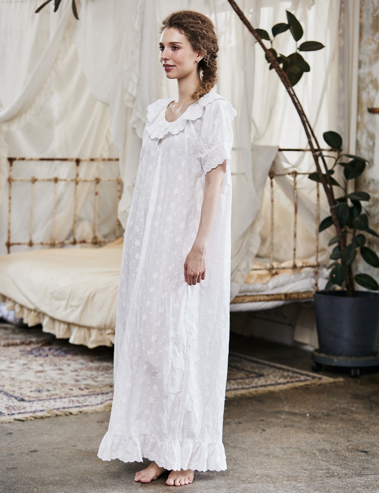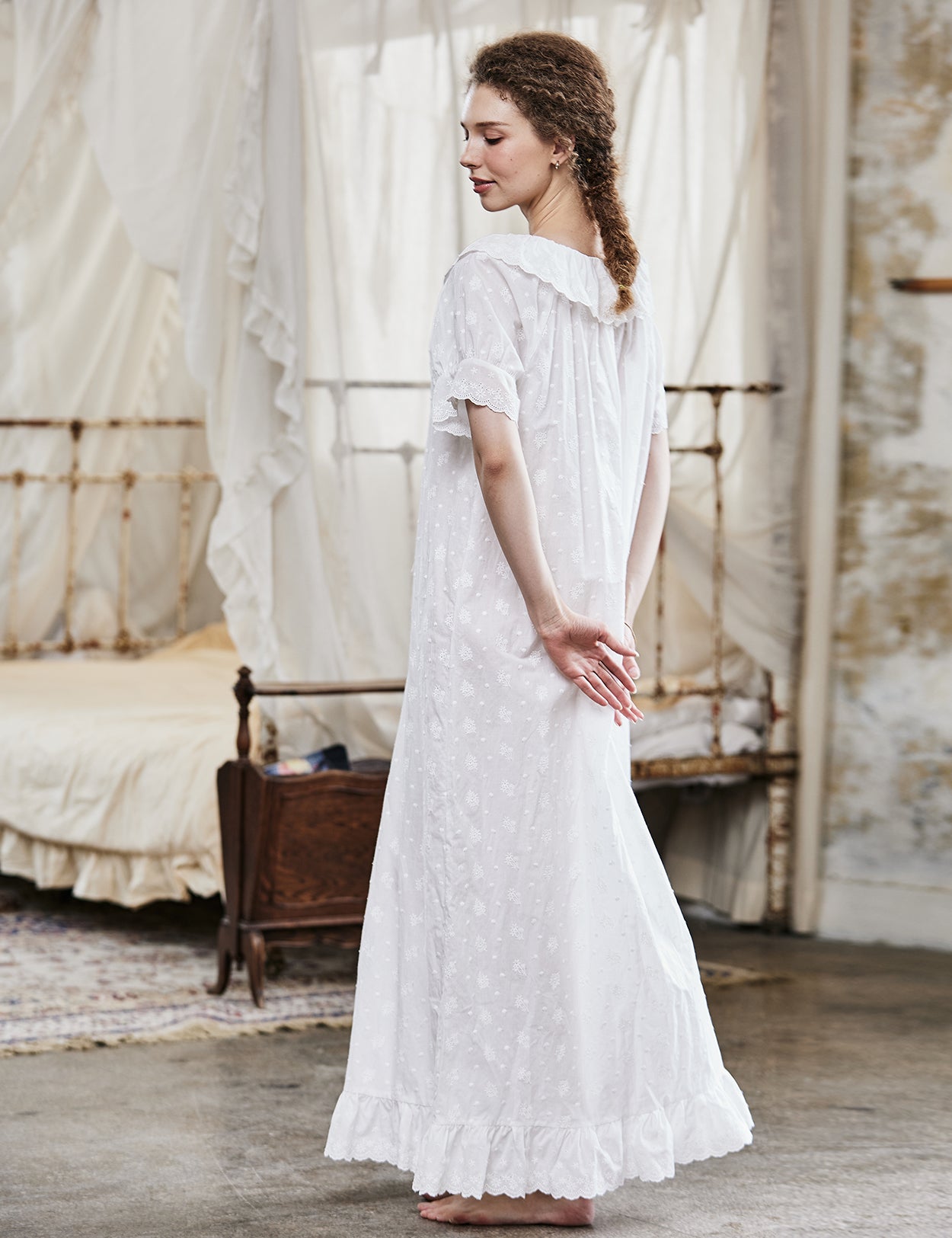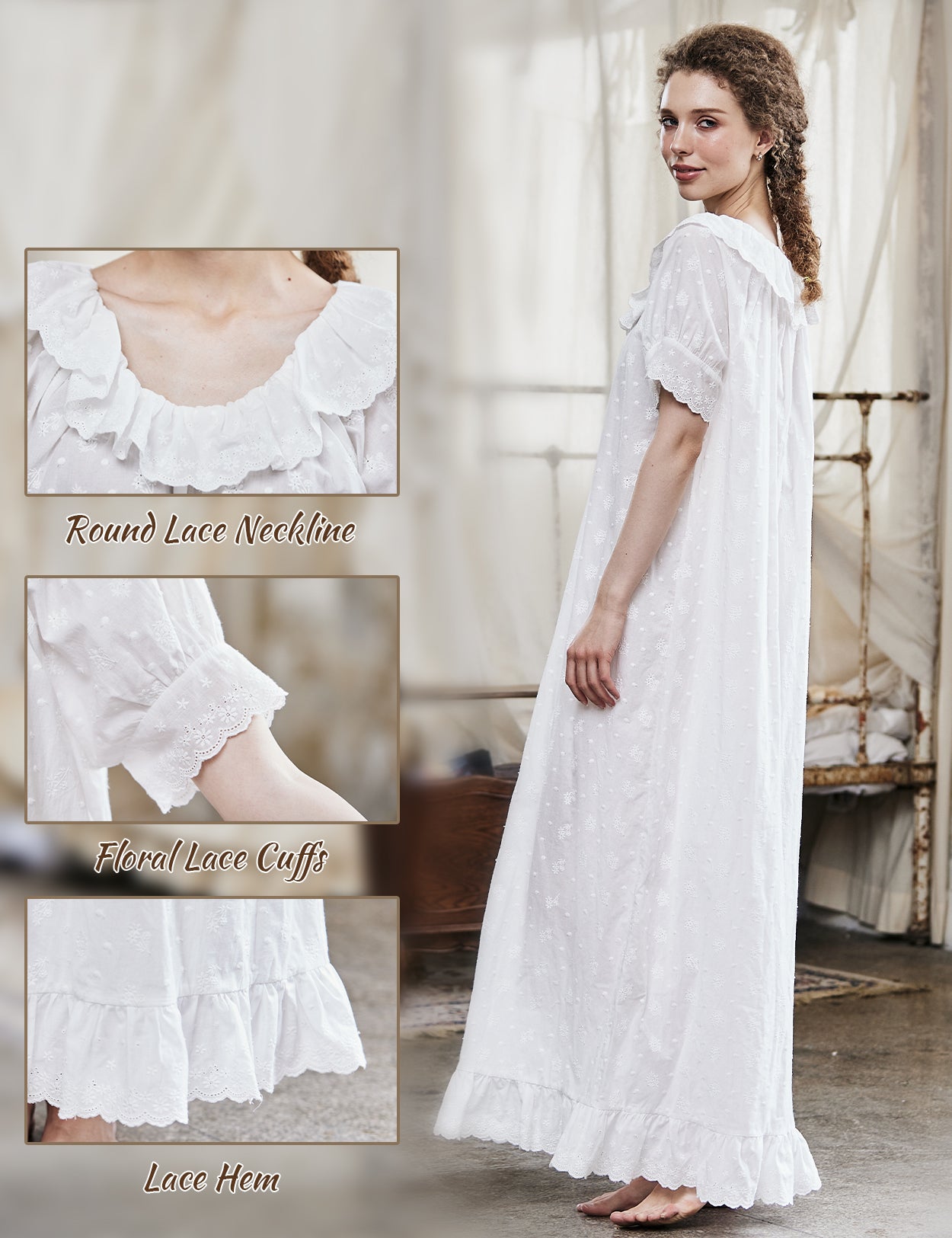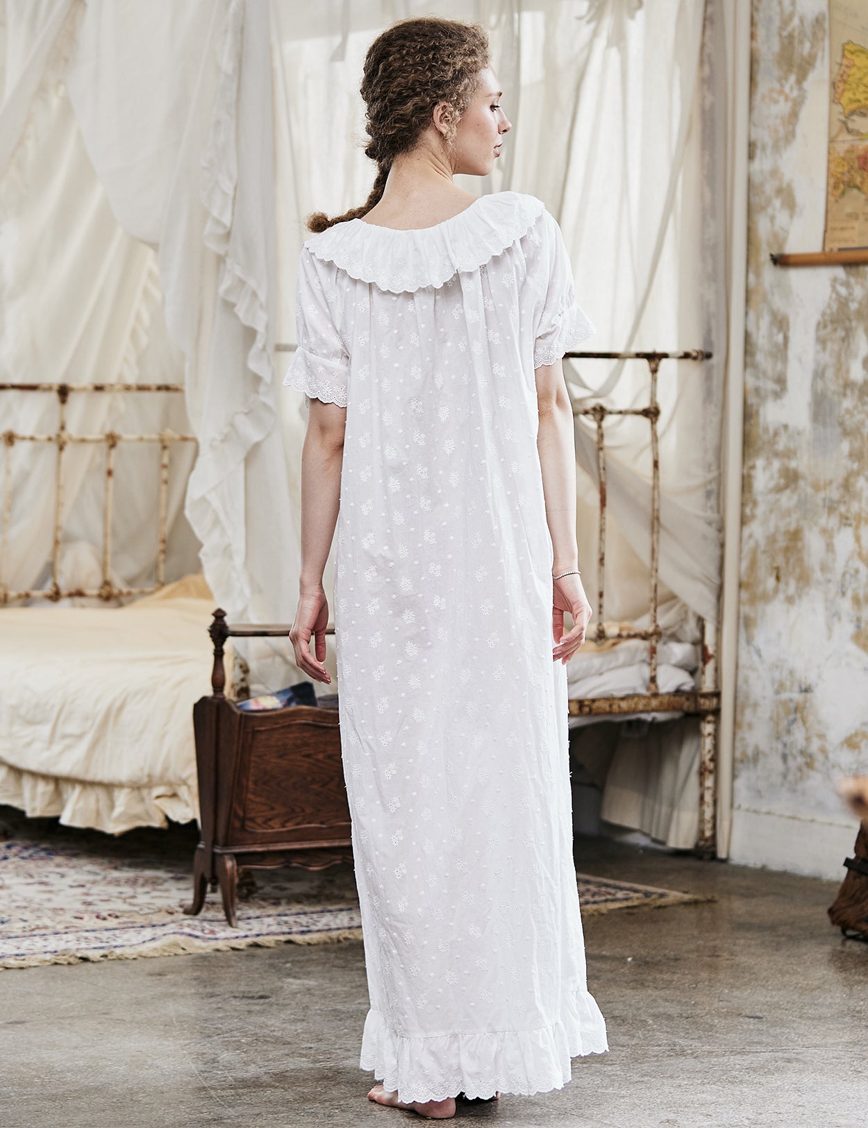 Dieses von der viktorianischen Zeit inspirierte Nachthemd ist aus weicher, atmungsaktiver 100 % Baumwolle in einem eleganten, cremefarbenen Ton gefertigt und verfügt über zarte Punkt- und Blumenstickereien für einen wunderschön strukturierten Look. Das natürliche, ungebleichte Material sorgt für Komfort und Sicherheit beim ganztägigen Tragen.