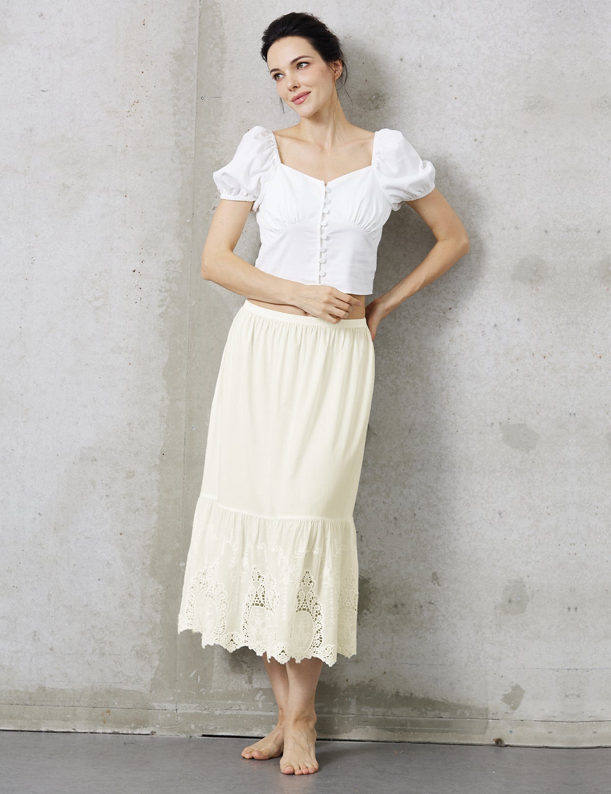 Design Details: Designed in a flowing A-line silhouette. The highlight is the wide hem panel featuring heavy Broderie Anglaise cutwork with oval medallions and delicate dotted florals, finished with a romantic scalloped edge.