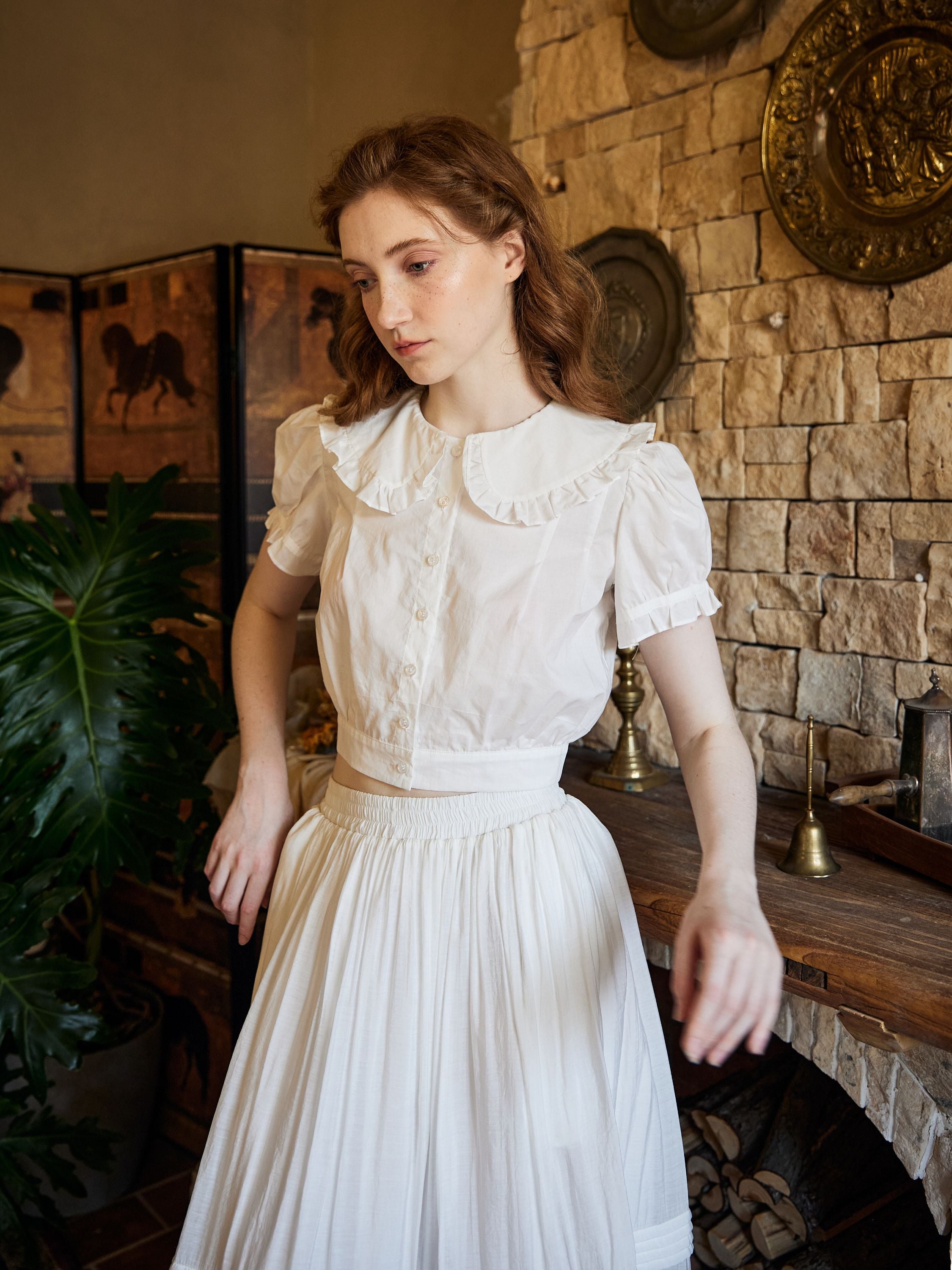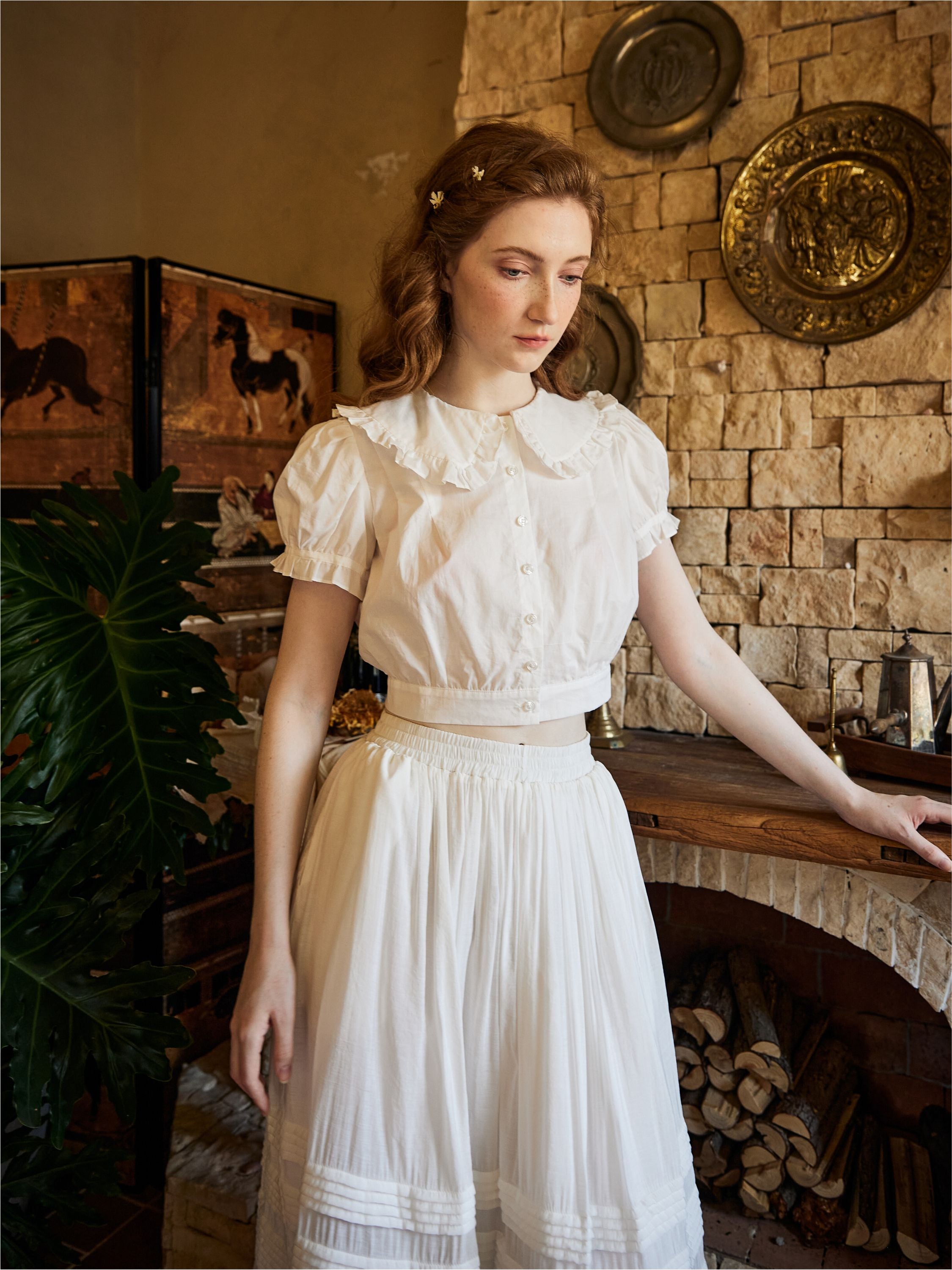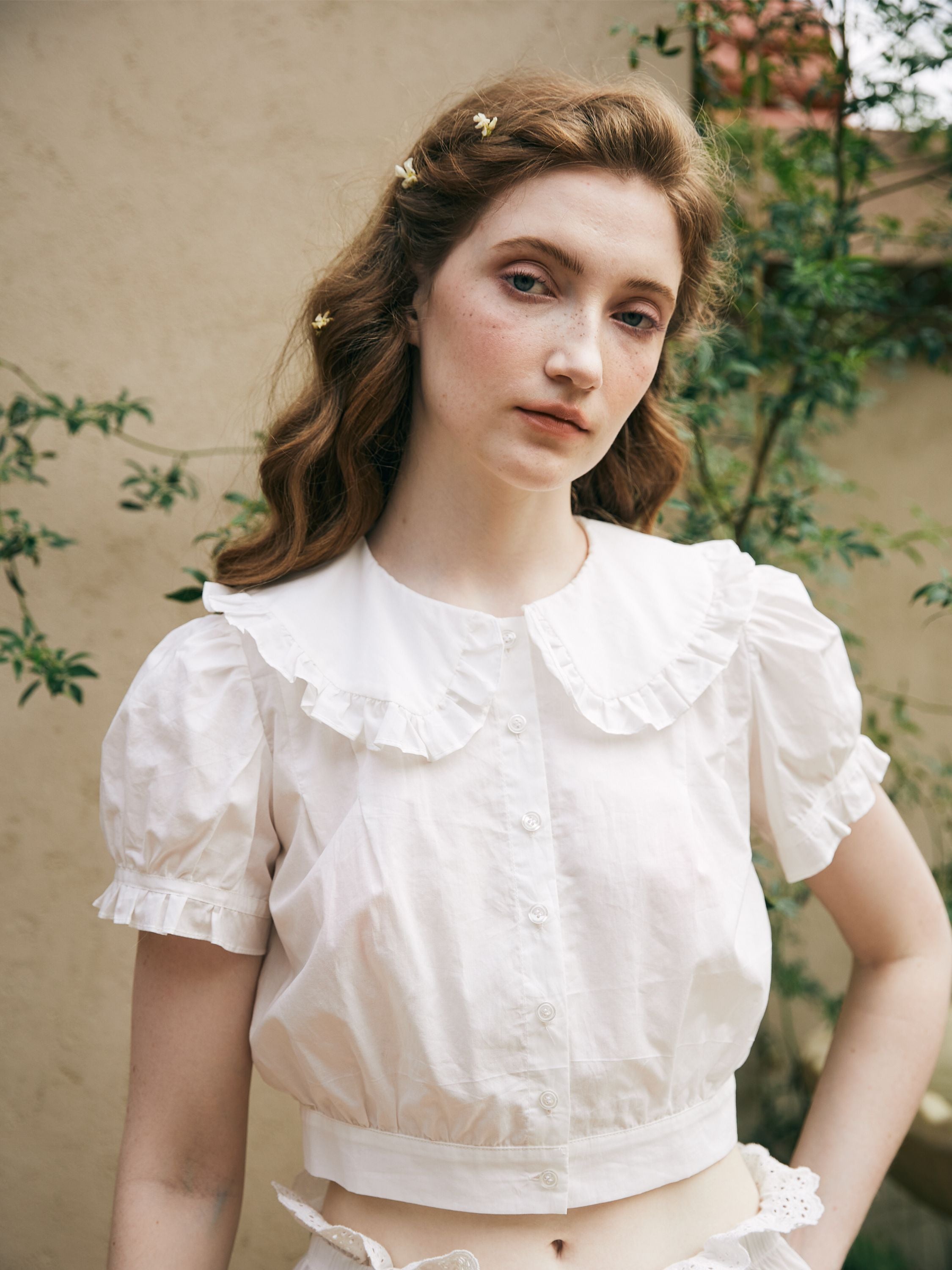 Haut court 100 % coton d'inspiration vintage - Col Claudine et manches bouffantes à volants