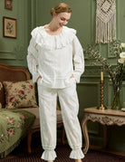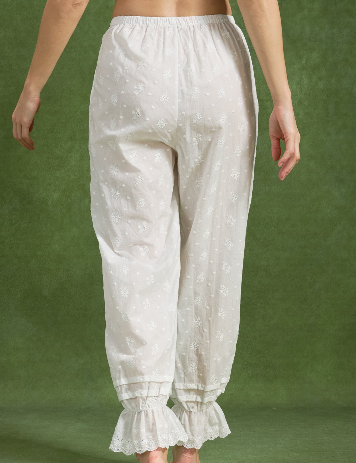 Les revers de cheville ajustés sont rehaussés de détails en double bande et élégamment finis par de délicates broderies florales et une bordure en dentelle à l'ourlet.