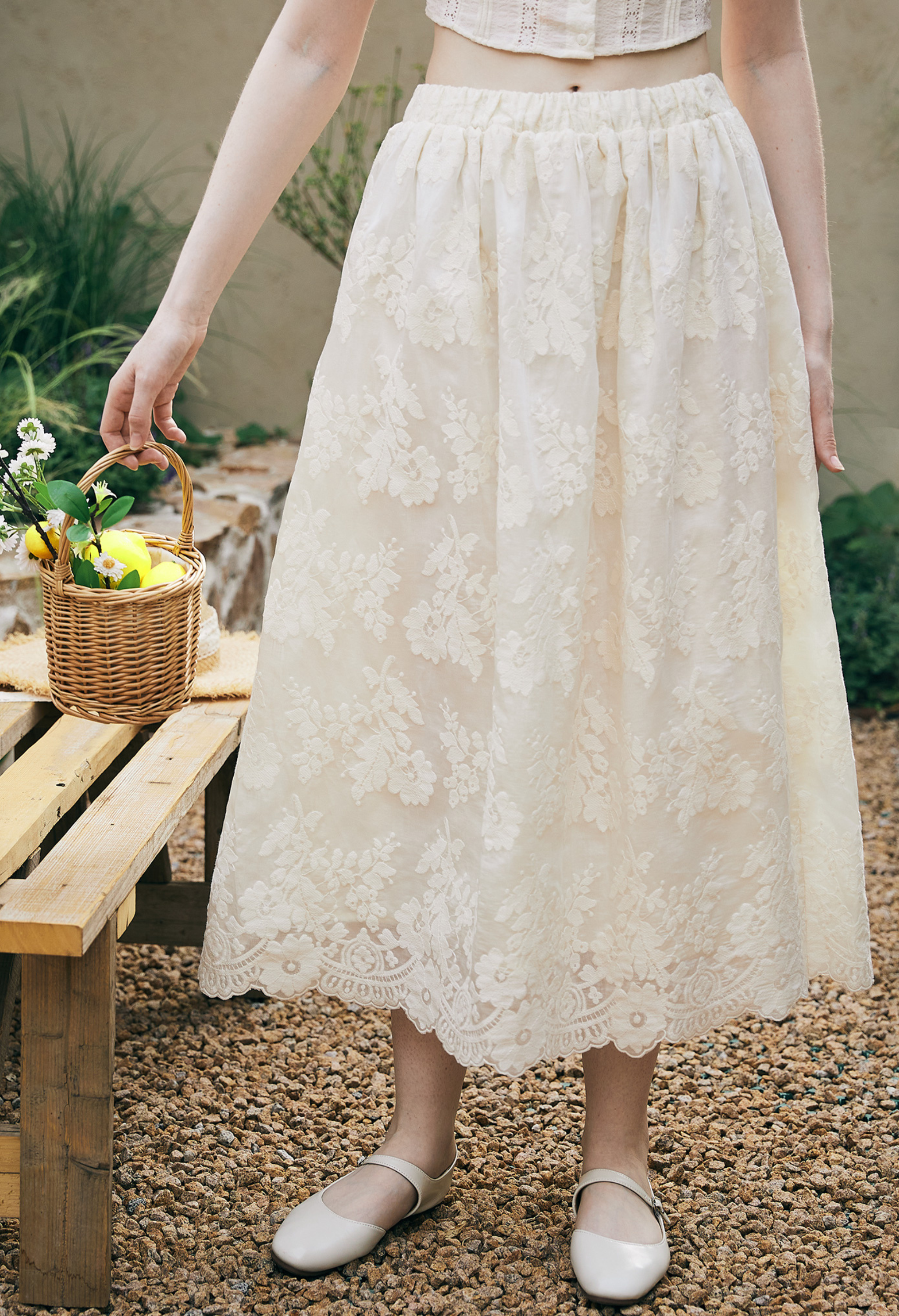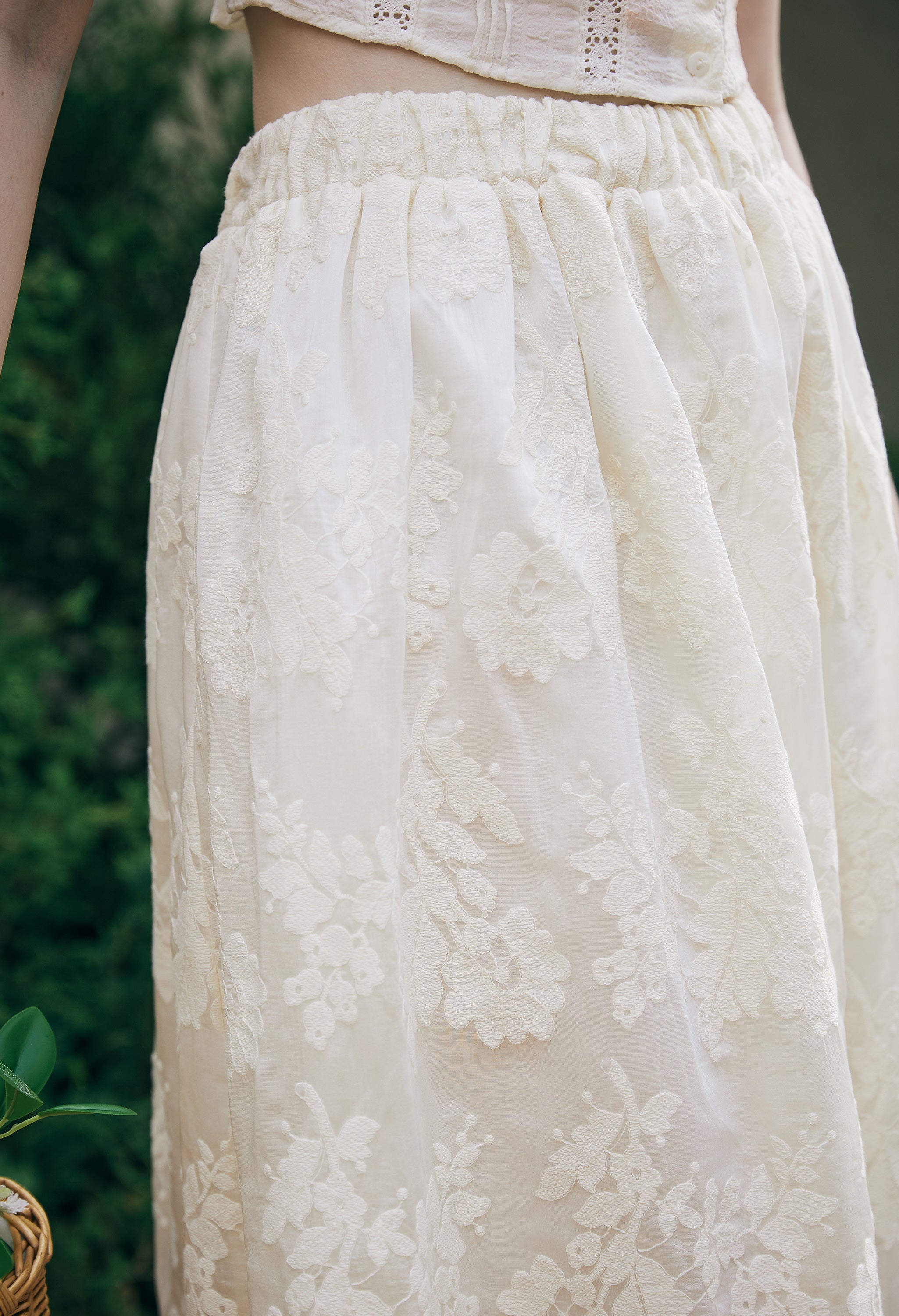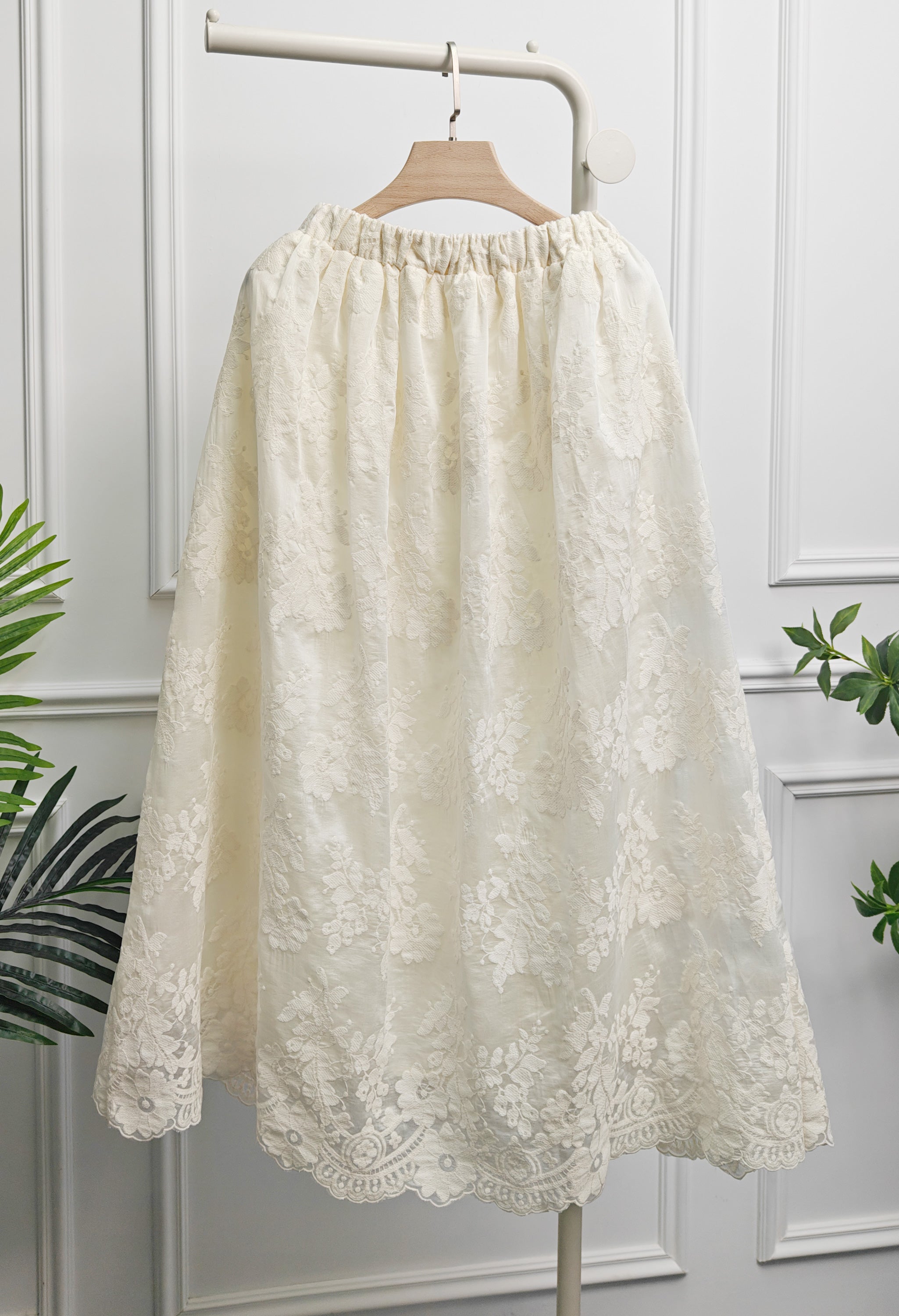 Jupe longue en coton avec broderie florale et dentelle, ceinture élastique et doublure